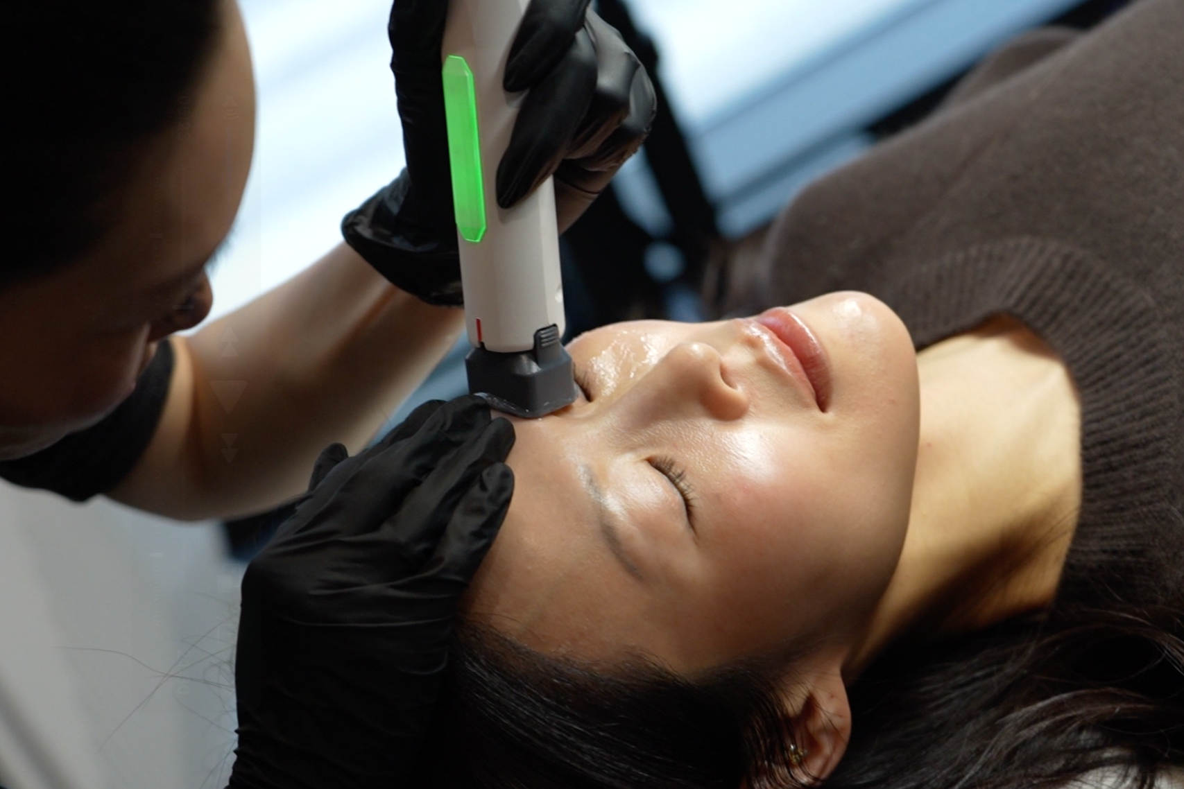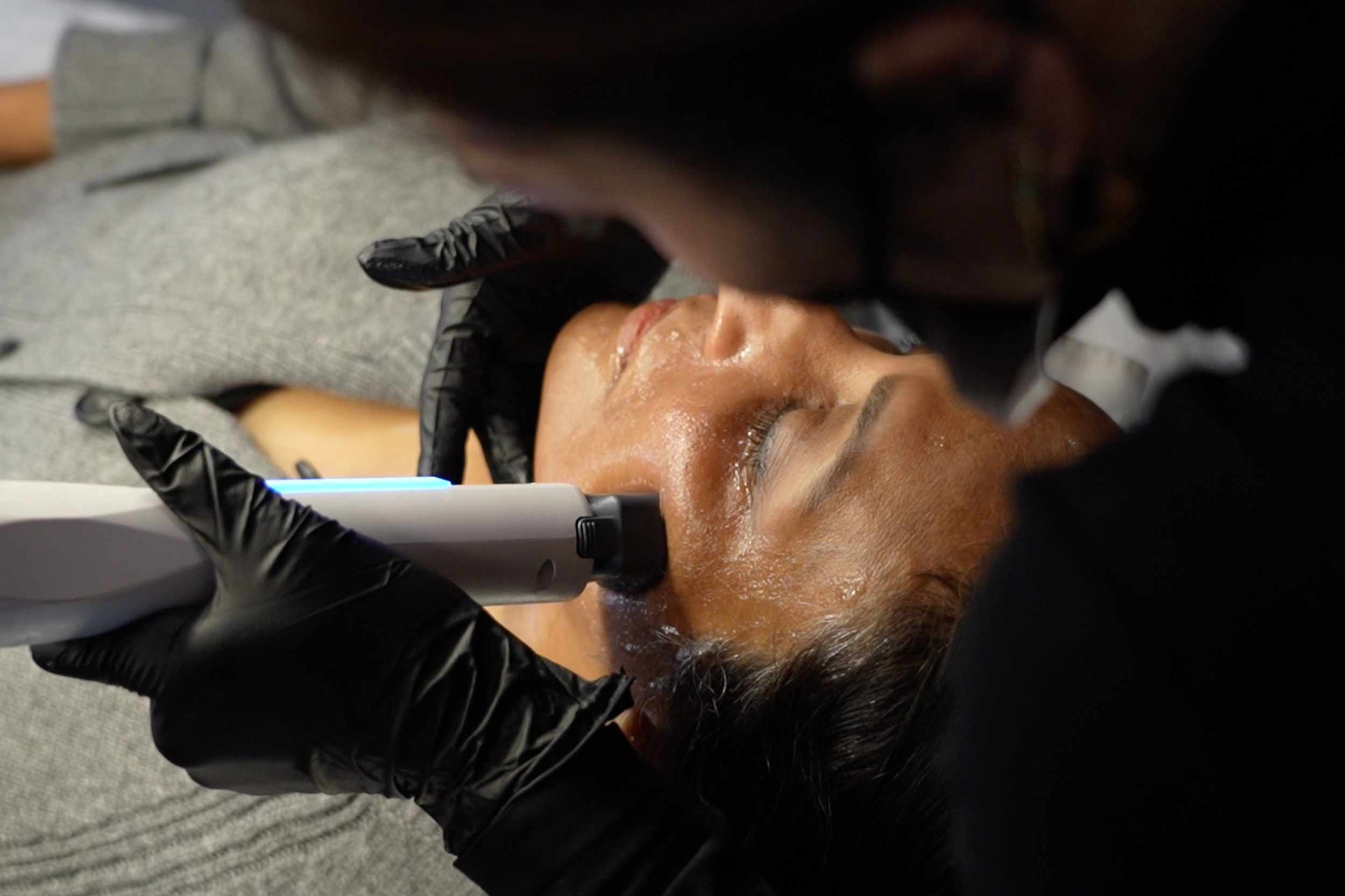 During the treatment, controlled radiofrequency (RF) energy is delivered into the deeper layers of the skin. Clients typically experience a warming sensation as the energy stimulates collagen and structural support within the dermal layers.